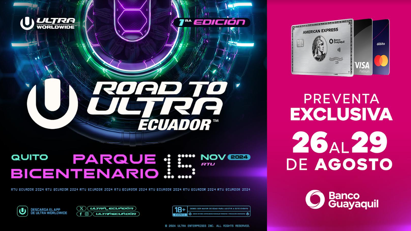 Banco Guayaquil reafirma su presencia en los eventos más destacados a nivel nacional, esta vez en el festival de música electrónica más reconocido a nivel mundial, el Road to Ultra Ecuador, que se realiza por primera vez en el país, ofreciendo una experiencia única a sus clientes a través de la preventa exclusiva de las entradas desde este lunes 26 hasta el jueves 29 de agosto con todas las tarjetas de Banco Guayaquil y Peigo.